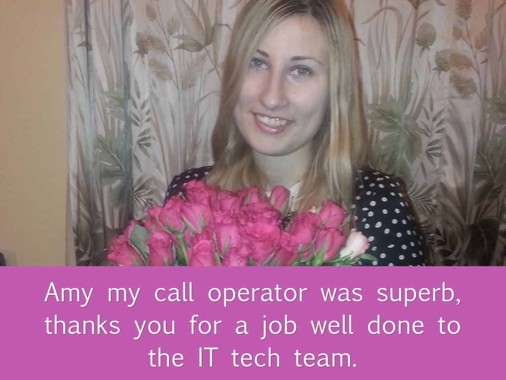 Amy my call operator was superb, thanks you for a job well done to the IT tech team.