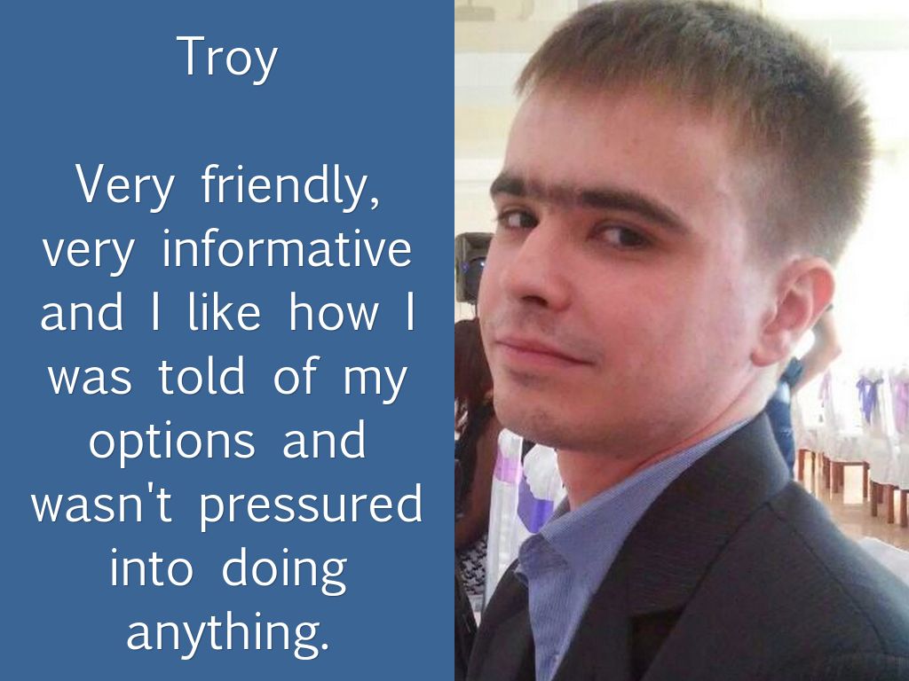 Very friendly, very informative and I like how I was told of my options and wasn't pressured into doing anything.