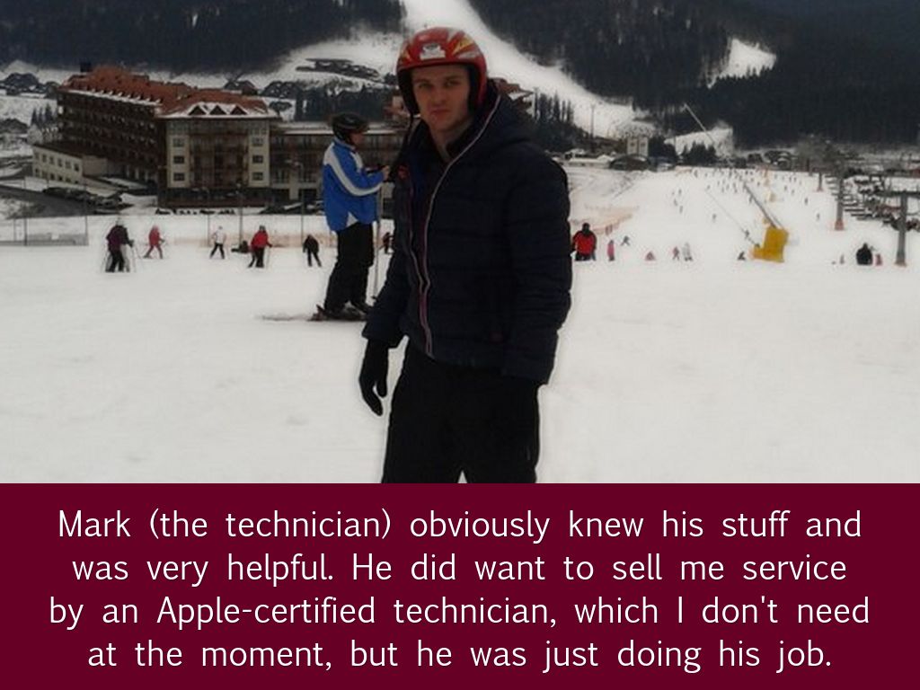 Mark (the technician) obviously knew his stuff and was very helpful. He did want to sell me service by an Apple-certified technician, which I don't need at the moment, but he was just doing his job.
