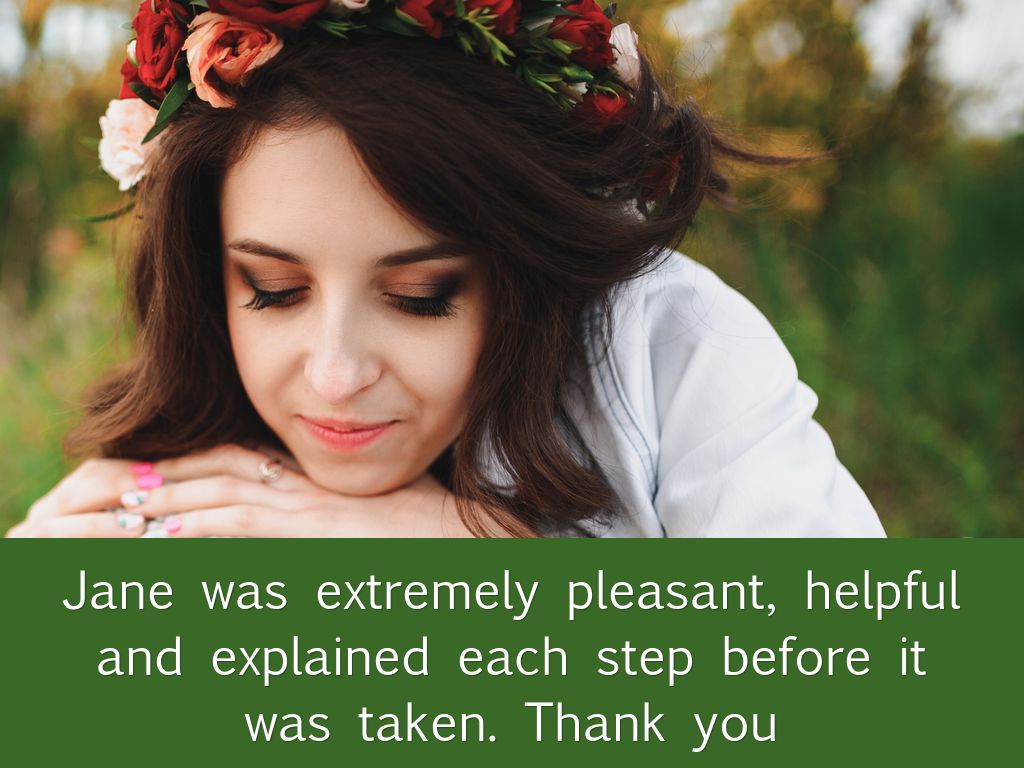 Jane was extremely pleasant, helpful and explained each step before it was taken. Thank you