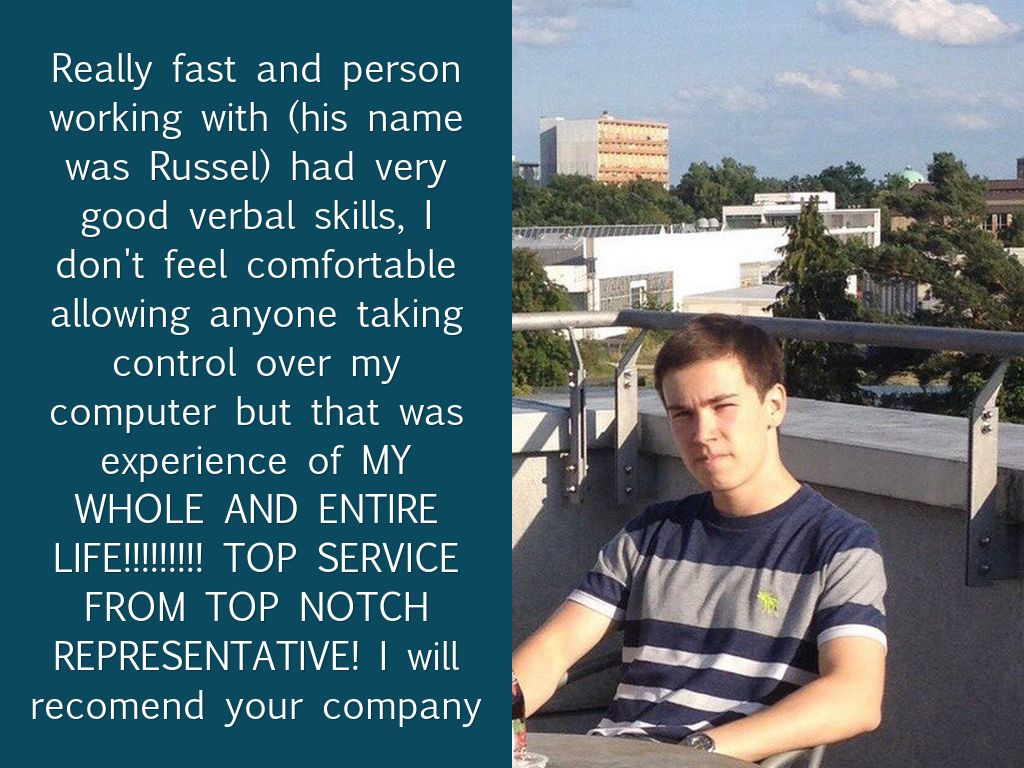 Really fast and person working with (his name was Russel) had very good verbal skills, I don't feel comfortable allowing anyone taking control over my computer but that was experience of MY WHOLE AND ENTIRE LIFE!!!!!!!!! TOP SERVICE FROM TOP NOTCH REPRESENTATIVE! I will recomend your company