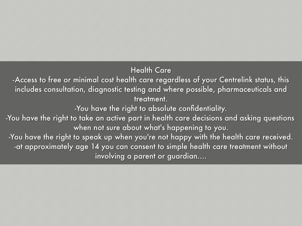 -Access to free or minimal cost health care regardless of your Centrelink status, this includes consultation, diagnostic testing and where possible, pharmaceuticals and treatment.