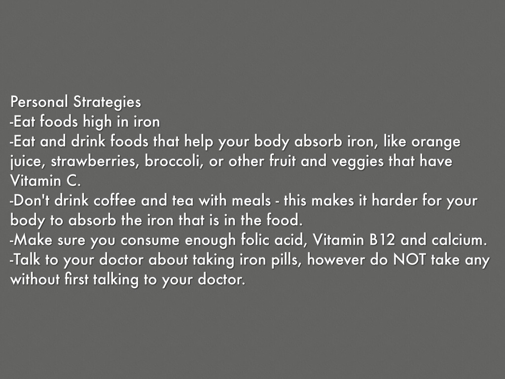 -Talk to your doctor about taking iron pills, however do NOT take any without first talking to your doctor.