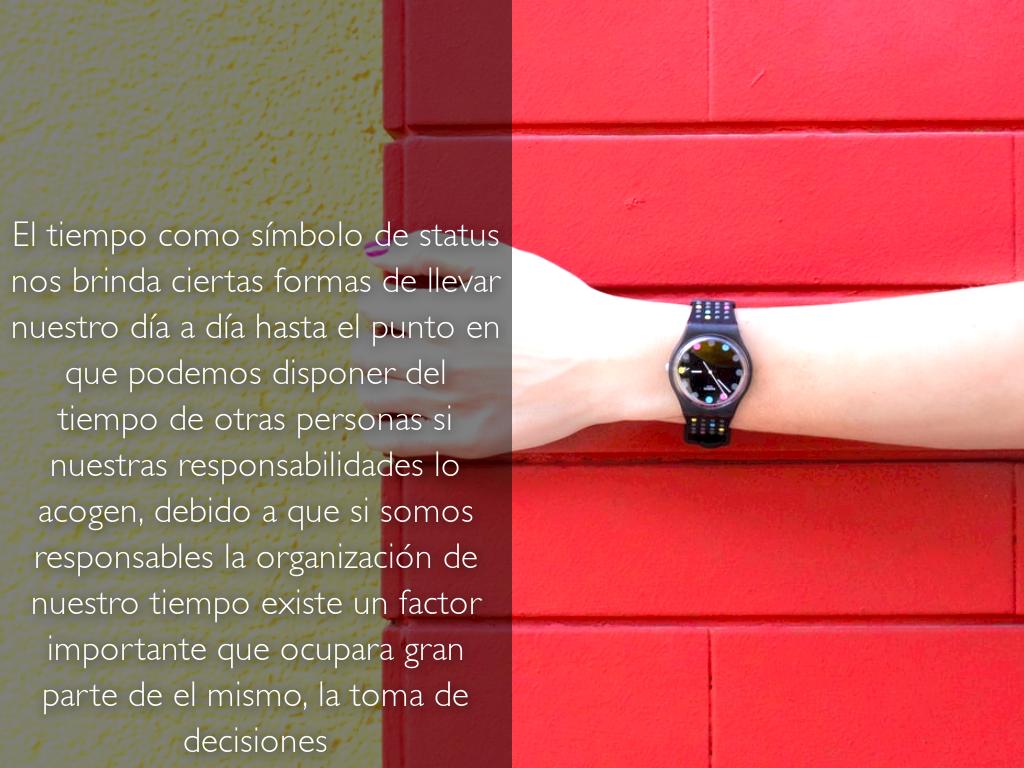 El tiempo como símbolo de status nos brinda ciertas formas de llevar nuestro día a día hasta el punto en que podemos disponer del tiempo de otras personas si nuestras responsabilidades lo acogen, debido a que si somos responsables la organización de nuestro tiempo existe un factor importante que ocupara gran parte de el mismo, la toma de decisiones