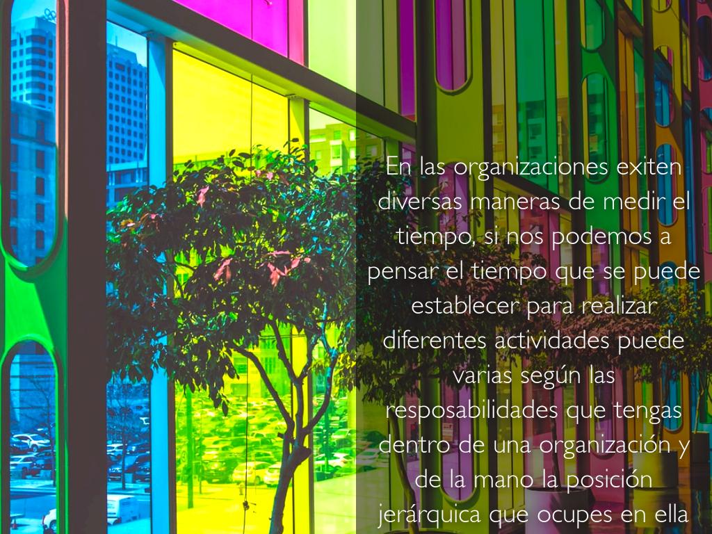 En las organizaciones exiten diversas maneras de medir el tiempo, si nos podemos a pensar el tiempo que se puede establecer para realizar diferentes actividades puede varias según las resposabilidades que tengas dentro de una organización y de la mano la posición jerárquica que ocupes en ella
