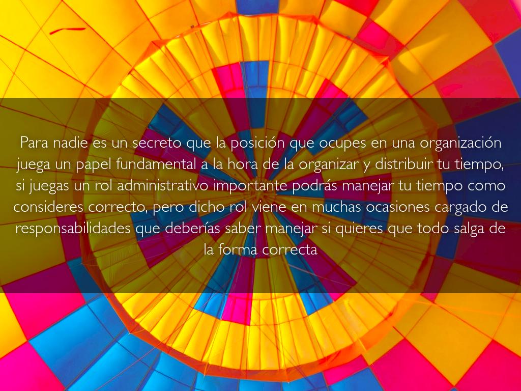 Para nadie es un secreto que la posición que ocupes en una organización juega un papel fundamental a la hora de la organizar y distribuir tu tiempo, si juegas un rol administrativo importante podrás manejar tu tiempo como consideres correcto, pero dicho rol viene en muchas ocasiones cargado de responsabilidades que deberías saber manejar si quieres que todo salga de la forma correcta