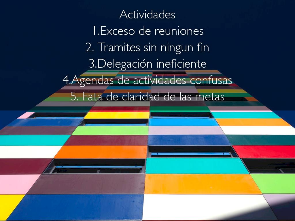 Actividades 1.Exceso de reuniones 2. Tramites sin ningun fin 3.Delegación ineficiente 4.Agendas de actividades confusas 5. Fata de claridad de las metas