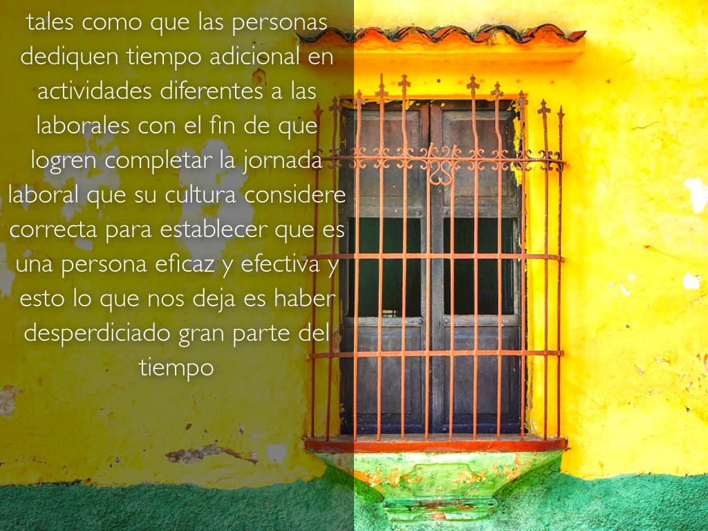 tales como que las personas dediquen tiempo adicional en actividades diferentes a las laborales con el fin de que logren completar la jornada laboral que su cultura considere correcta para establecer que es una persona eficaz y efectiva y esto lo que nos deja es haber desperdiciado gran parte del tiempo