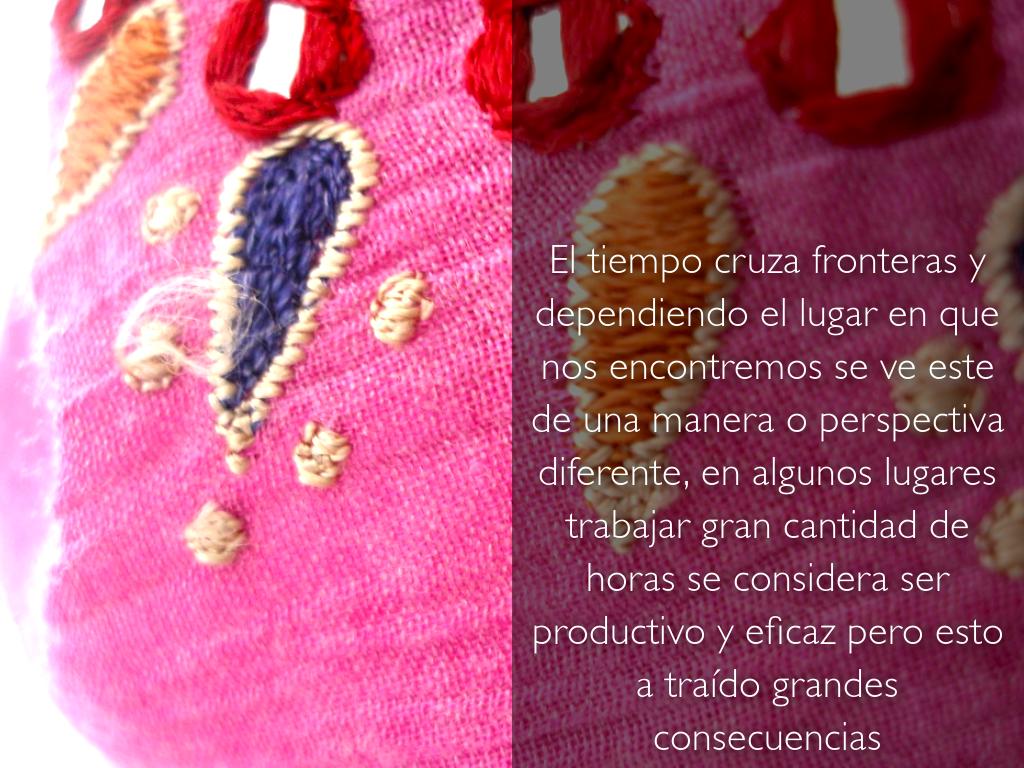 El tiempo cruza fronteras y dependiendo el lugar en que nos encontremos se ve este de una manera o perspectiva diferente, en algunos lugares trabajar gran cantidad de horas se considera ser productivo y eficaz pero esto a traído grandes consecuencias