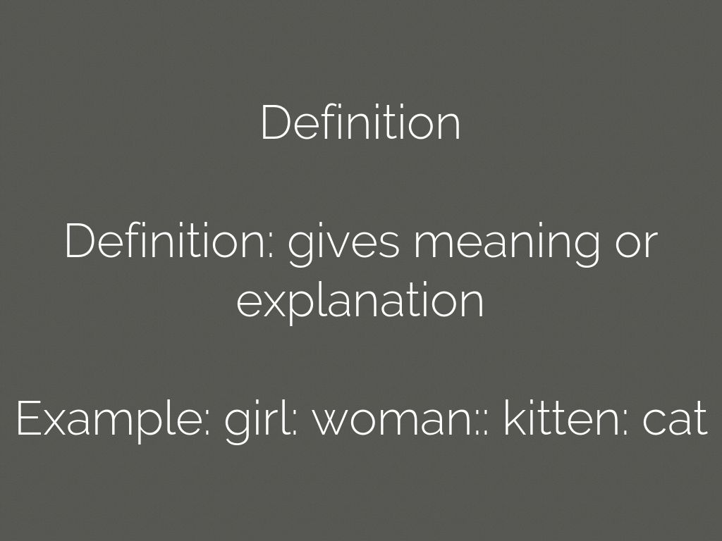 An analogy makes comparison or relationship between sets of words, objects, or figures.