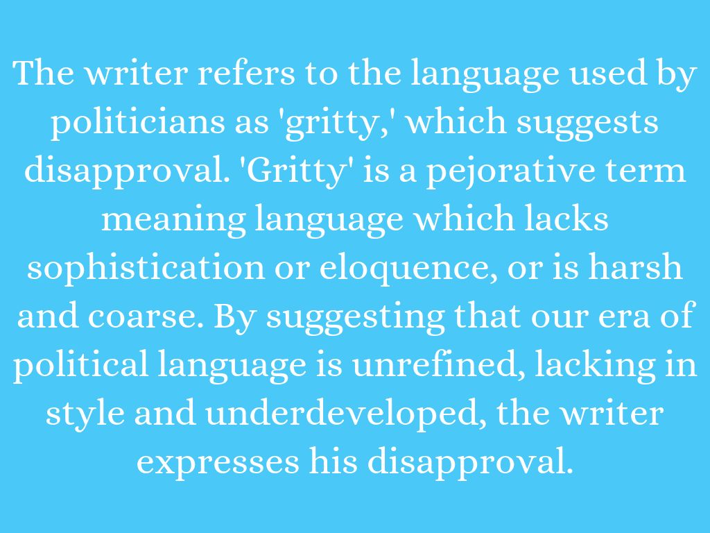 The writer refers to the language used by politicians as 'gritty,' which suggests disapproval. 'Gritty' is a pejorative term meaning language which lacks sophistication or eloquence, or is harsh and coarse. By suggesting that our era of political language is unrefined, lacking in style and underdeveloped, the writer expresses his disapproval.