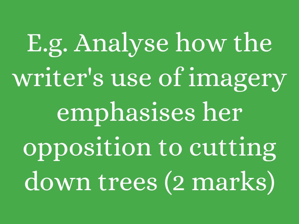 E.g. Analyse how the writer's use of imagery emphasises her opposition to cutting down trees (2 marks)