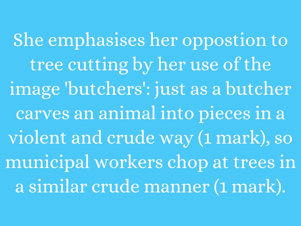 She emphasises her oppostion to tree cutting by her use of the image 'butchers': just as a butcher carves an animal into pieces in a violent and crude way (1 mark), so municipal workers chop at trees in a similar crude manner (1 mark).