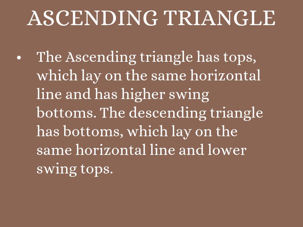 The Ascending triangle has tops, which lay on the same horizontal line and has higher swing