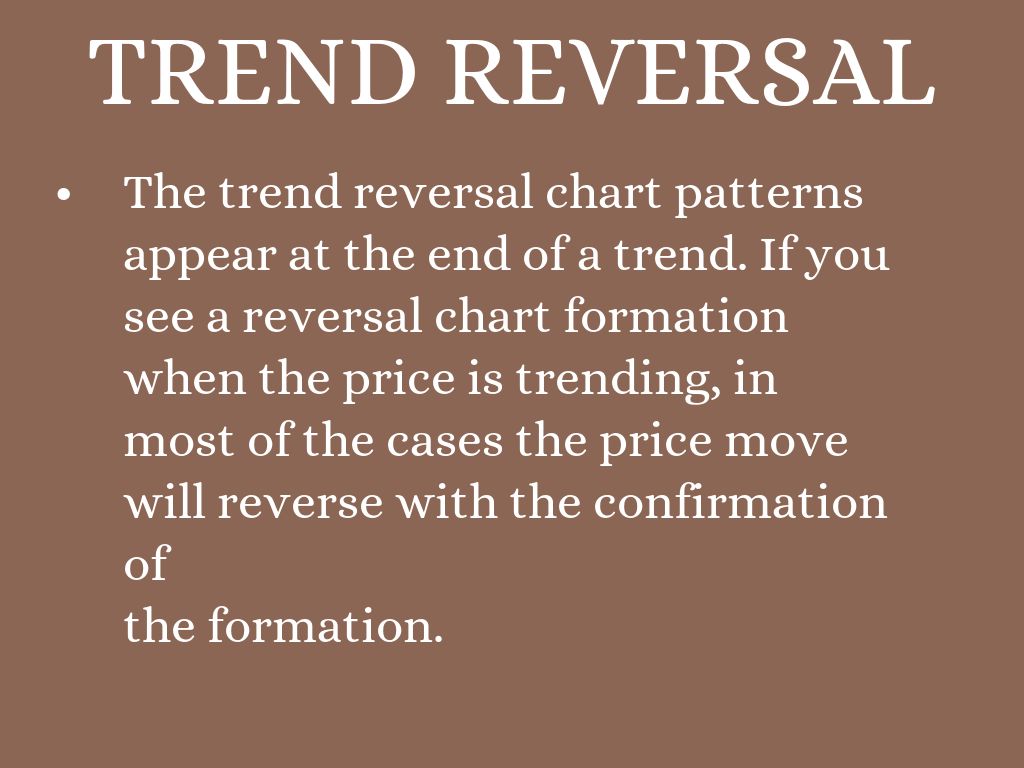 The trend reversal chart patterns appear at the end of a trend. If you see a reversal chart formation
