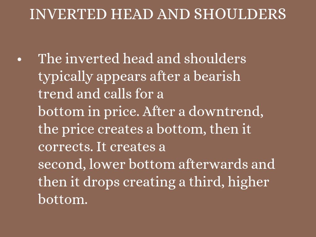 The inverted head and shoulders typically appears after a bearish trend and calls for a