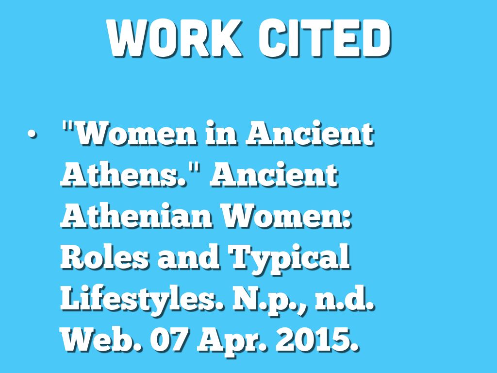 • "Women in Ancient Athens." Ancient Athenian Women: Roles and Typical Lifestyles. N.p., n.d. Web. 07 Apr. 2015.