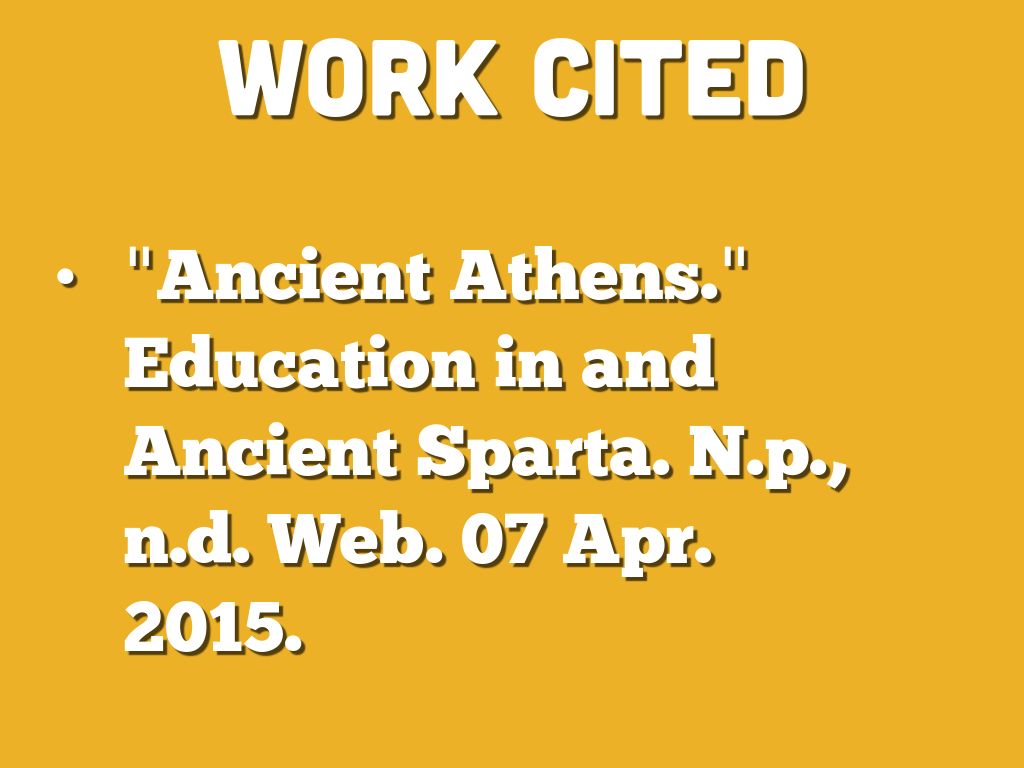 • "Ancient Athens." Education in and Ancient Sparta. N.p., n.d. Web. 07 Apr. 2015.