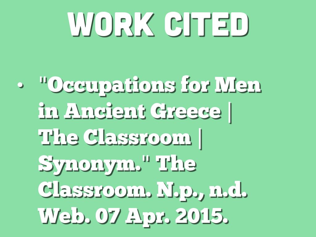 • "Occupations for Men in Ancient Greece | The Classroom | Synonym." The Classroom. N.p., n.d. Web. 07 Apr. 2015.