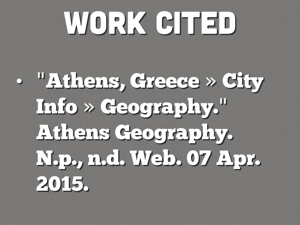 • "Athens, Greece » City Info » Geography." Athens Geography. N.p., n.d. Web. 07 Apr. 2015.