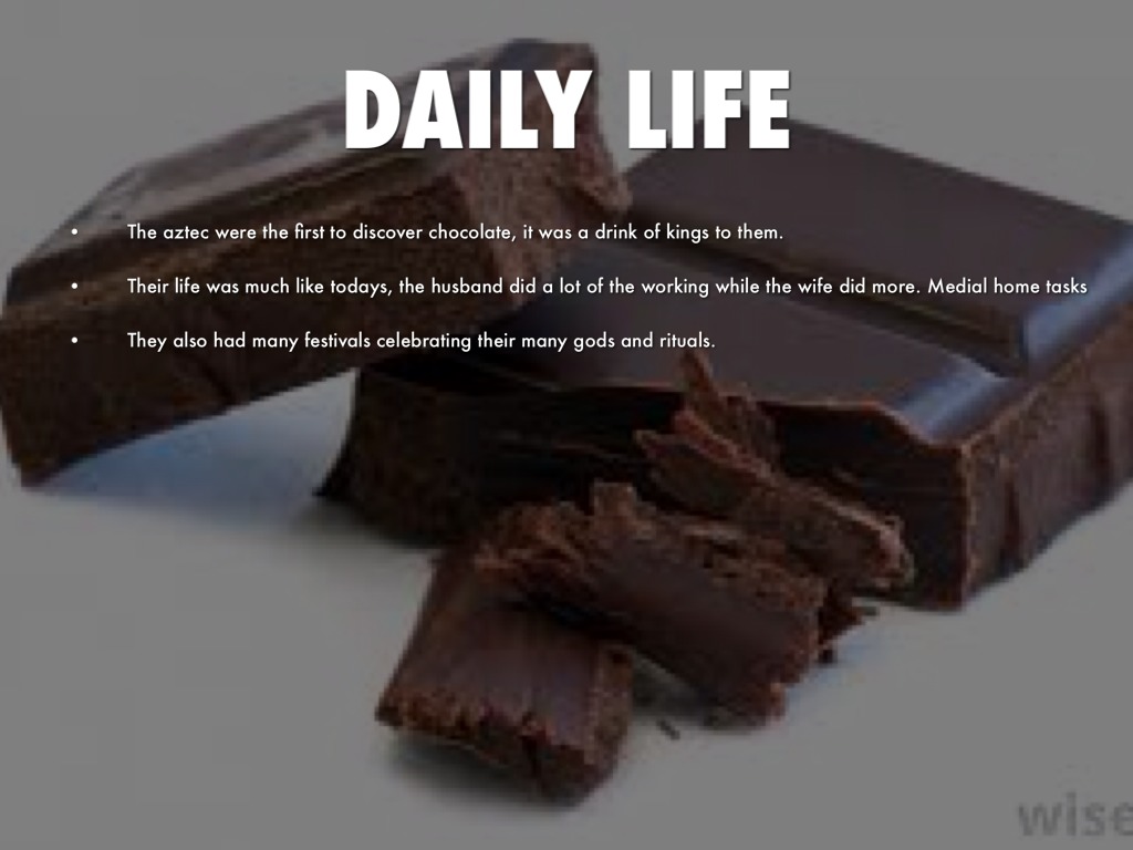 The aztec were the first to discover chocolate, it was a drink of kings to them.