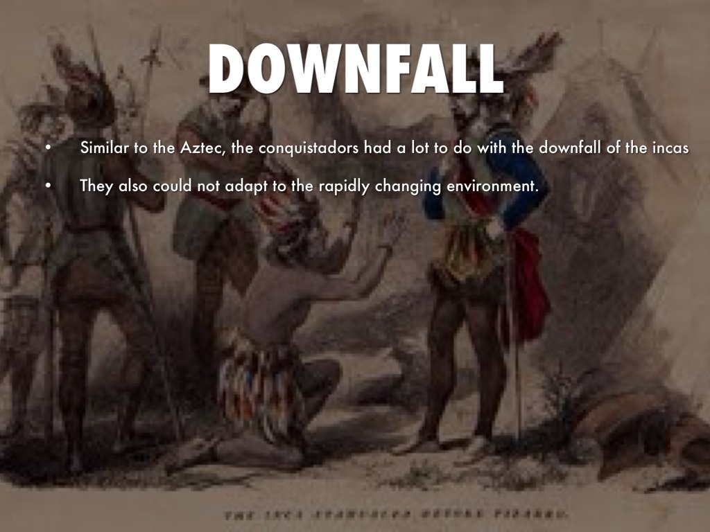 Similar to the Aztec, the conquistadors had a lot to do with the downfall of the incas