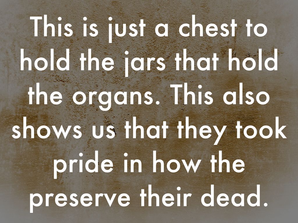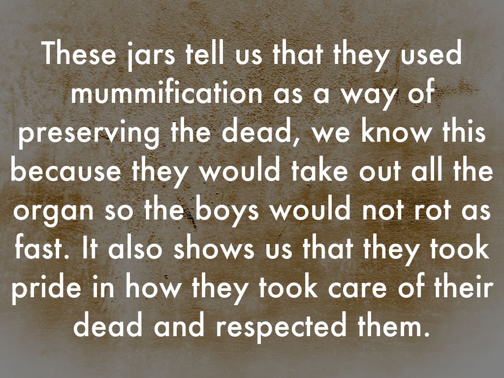 These jars tell us that they used mummification as a way of preserving the dead, we know this because they would take out all the organ so the boys would not rot as fast. It also shows us that they took pride in how they took care of their dead and respected them.