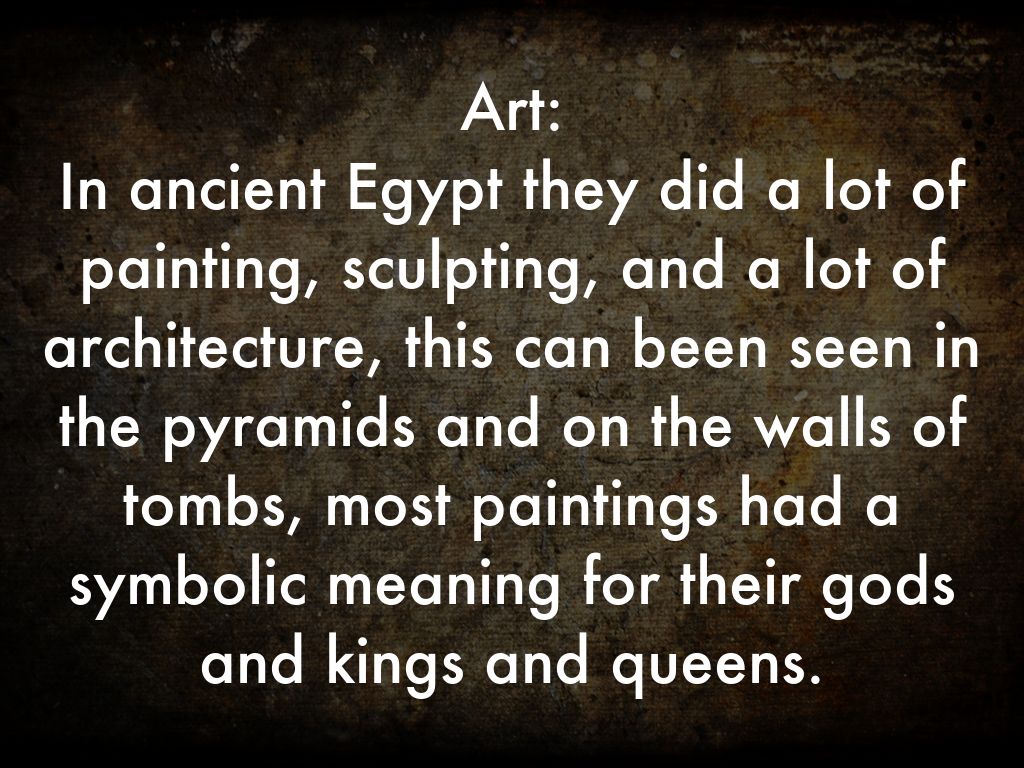 Art: In ancient Egypt they did a lot of painting, sculpting, and a lot of architecture, this can been seen in the pyramids and on the walls of tombs, most paintings had a symbolic meaning for their gods and kings and queens.