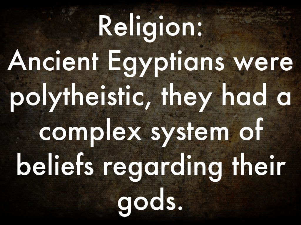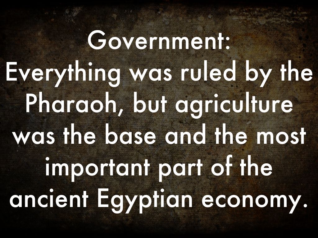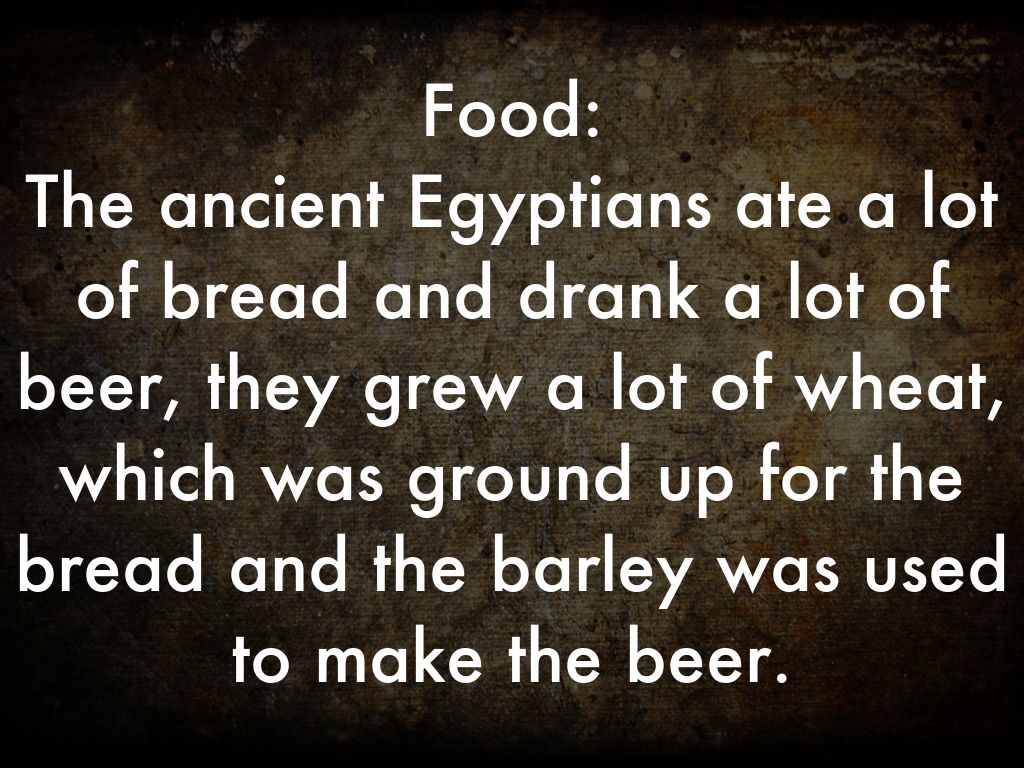 Food: The ancient Egyptians ate a lot of bread and drank a lot of beer, they grew a lot of wheat, which was ground up for the bread and the barley was used to make the beer.
