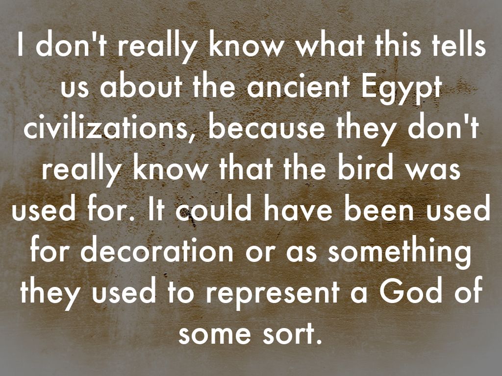 I don't really know what this tells us about the ancient Egypt civilizations, because they don't really know that the bird was used for. It could have been used for decoration or as something they used to represent a God of some sort.