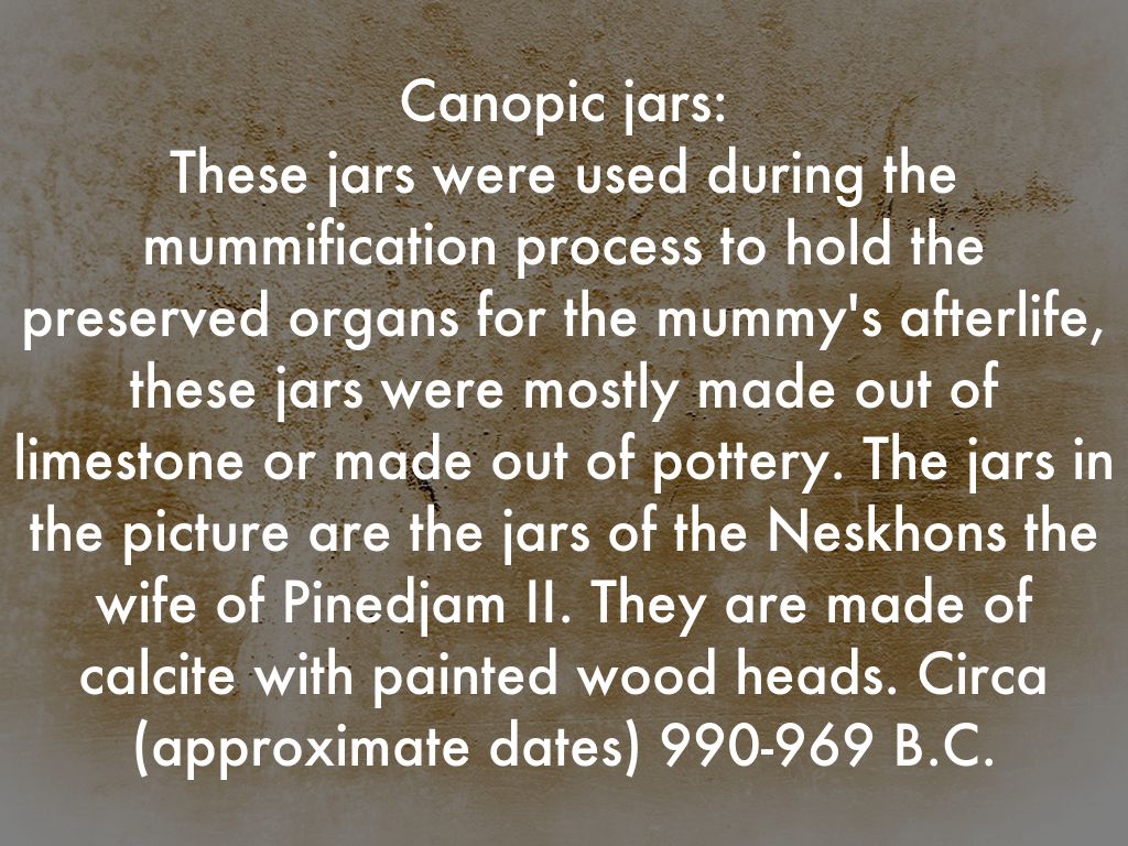 Canopic jars: These jars were used during the mummification process to hold the preserved organs for the mummy's afterlife, these jars were mostly made out of limestone or made out of pottery. The jars in the picture are the jars of the Neskhons the wife of Pinedjam II. They are made of calcite with painted wood heads. Circa (approximate dates) 990-969 B.C.
