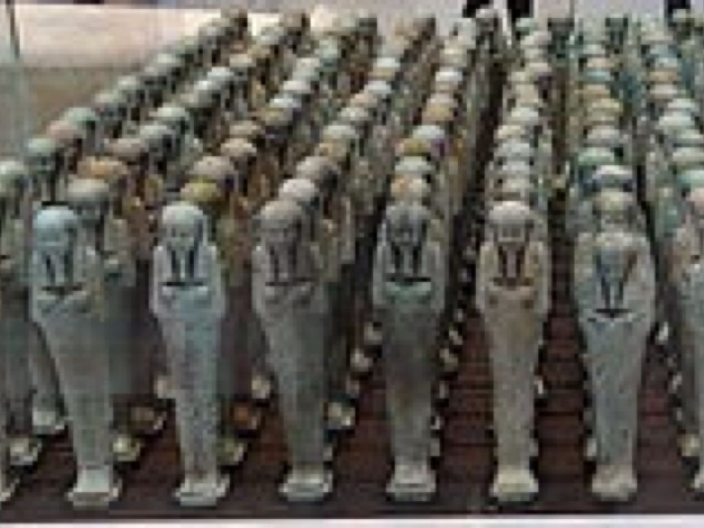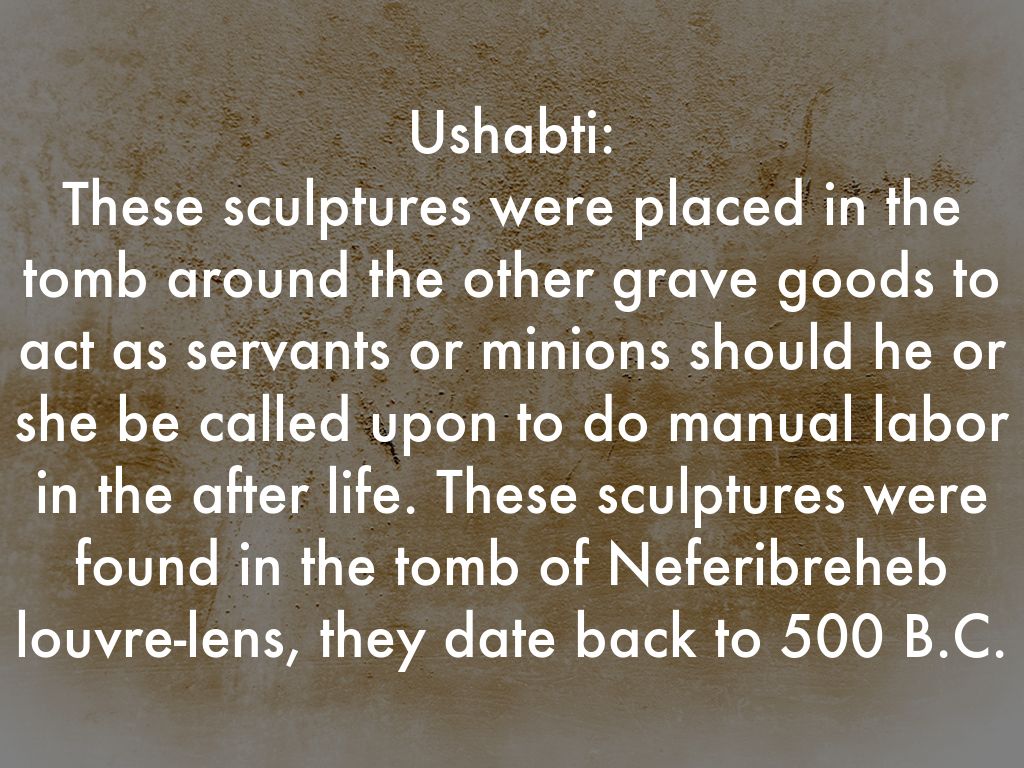 Ushabti: These sculptures were placed in the tomb around the other grave goods to act as servants or minions should he or she be called upon to do manual labor in the after life. These sculptures were found in the tomb of Neferibreheb louvre-lens, they date back to 500 B.C.