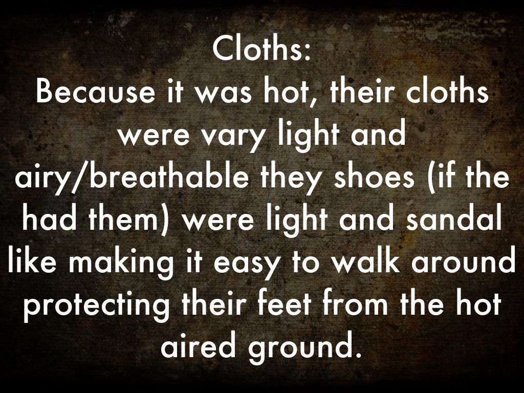 Cloths: Because it was hot, their cloths were vary light and airy/breathable they shoes (if the had them) were light and sandal like making it easy to walk around protecting their feet from the hot aired ground.