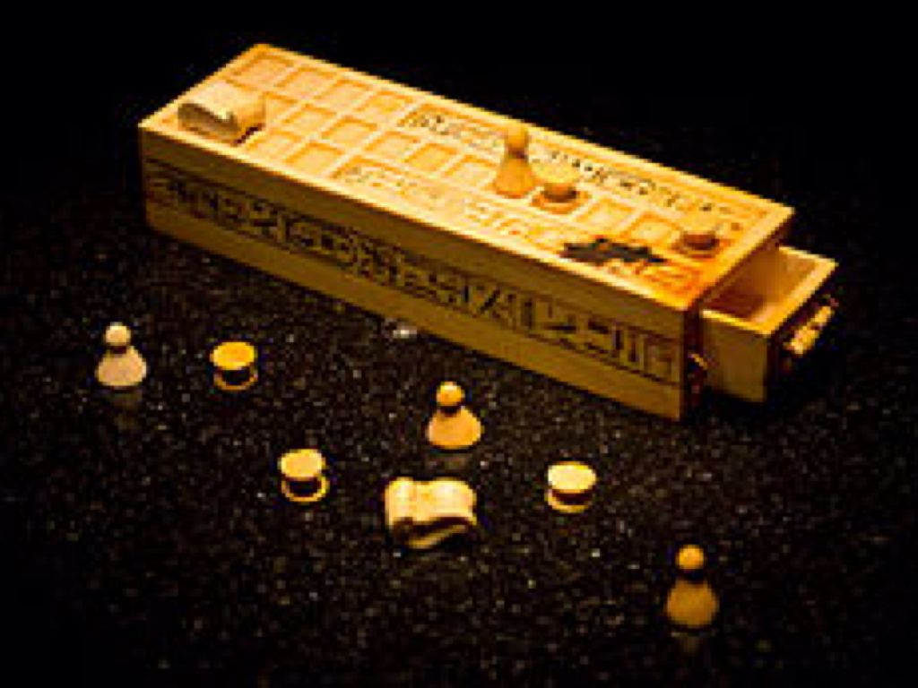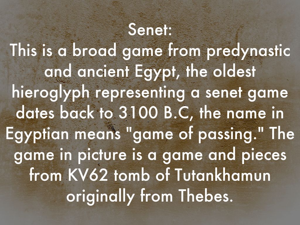 Senet: This is a broad game from predynastic and ancient Egypt, the oldest hieroglyph representing a senet game dates back to 3100 B.C, the name in Egyptian means "game of passing." The game in picture is a game and pieces from KV62 tomb of Tutankhamun originally from Thebes.