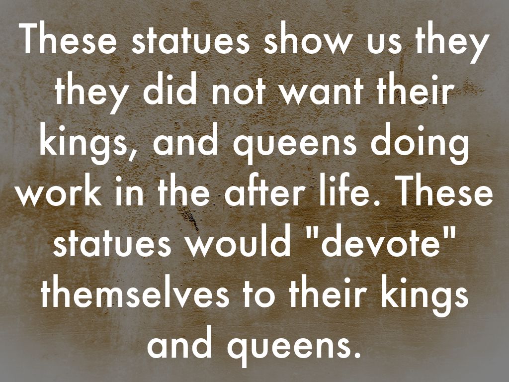 These statues show us they they did not want their kings, and queens doing work in the after life. These statues would "devote" themselves to their kings and queens.