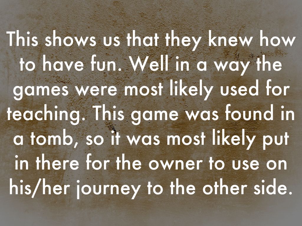 This shows us that they knew how to have fun. Well in a way the games were most likely used for teaching. This game was found in a tomb, so it was most likely put in there for the owner to use on his/her journey to the other side.