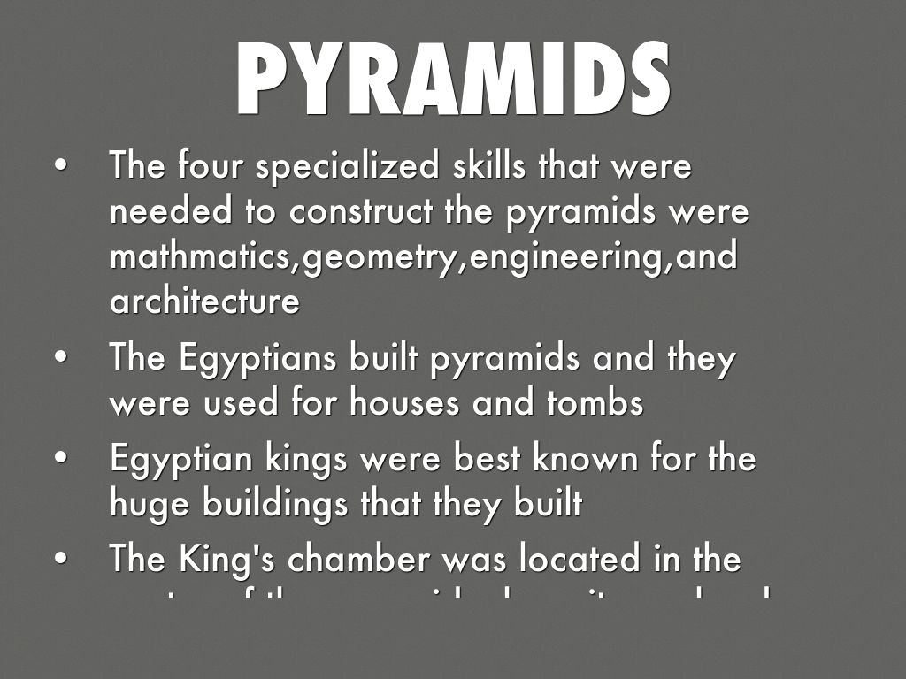 • The four specialized skills that were needed to construct the pyramids were mathmatics,geometry,engineering,and architecture