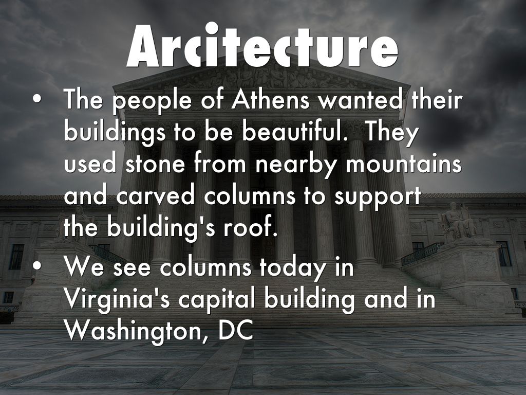 • The people of Athens wanted their buildings to be beautiful. They used stone from nearby mountains and carved columns to support the building's roof.