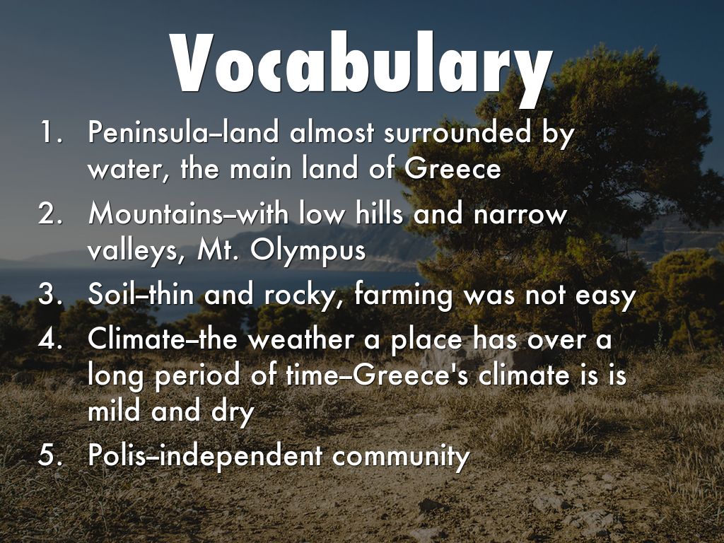 • Peninsula--land almost surrounded by water, the main land of Greece