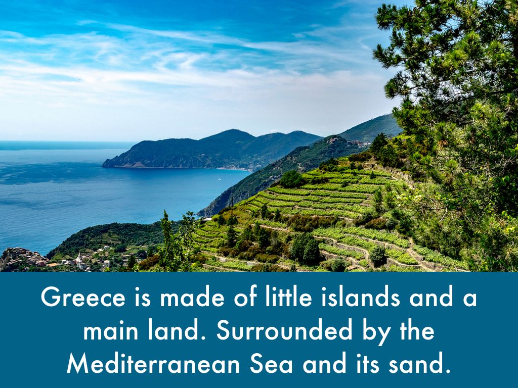 Greece is made of little islands and a main land. Surrounded by the Mediterranean Sea and its sand.