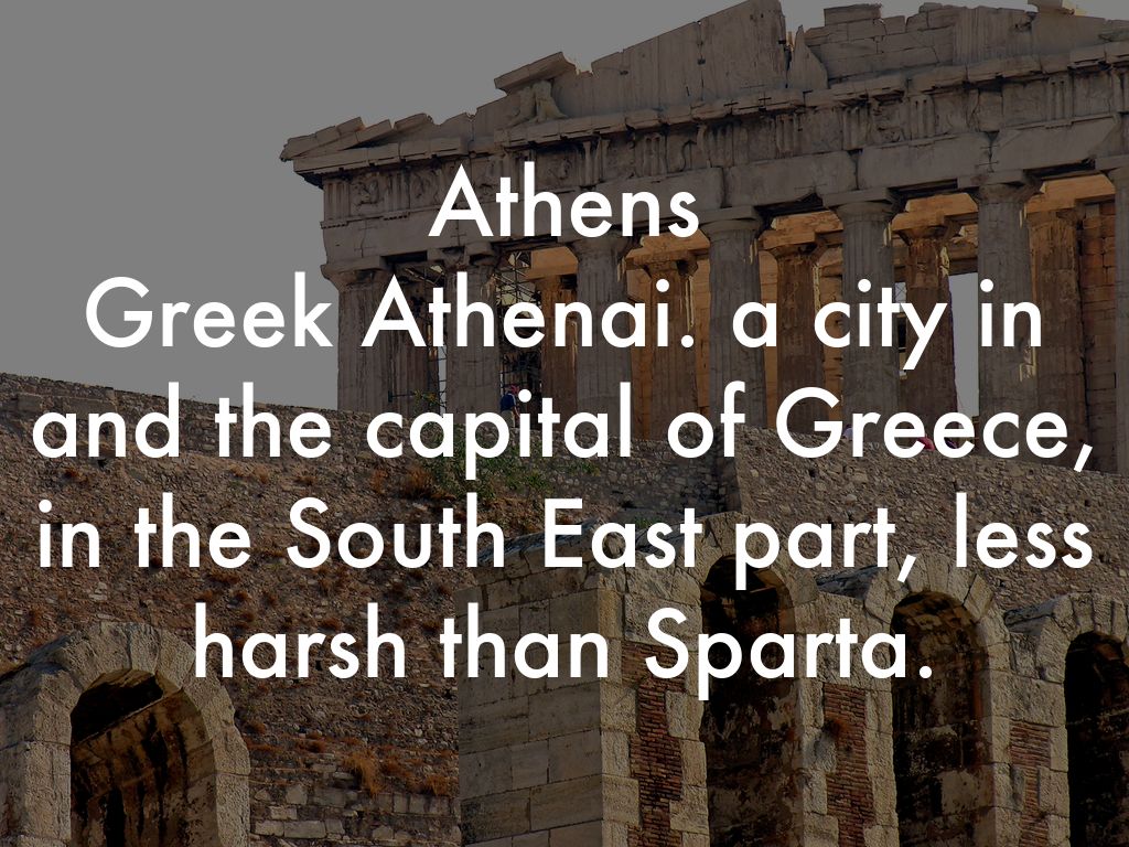 Greek Athenai. a city in and the capital of Greece, in the South East part, less harsh than Sparta.