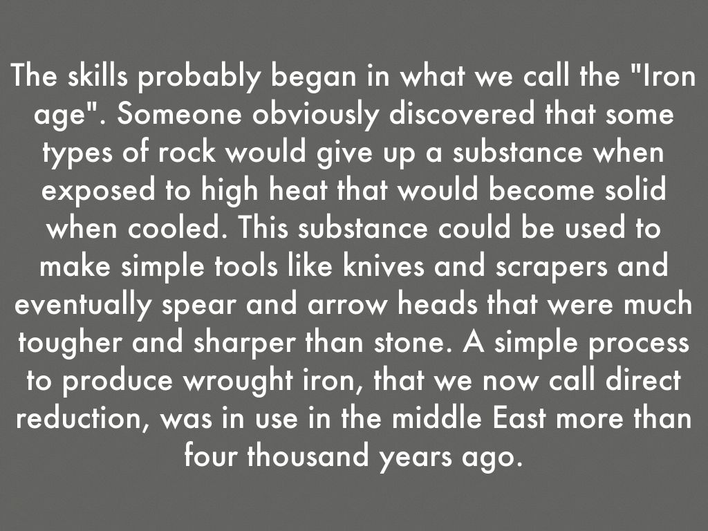 The skills probably began in what we call the "Iron age". Someone obviously discovered that some types of rock would give up a substance when exposed to high heat that would become solid when cooled. This substance could be used to make simple tools like knives and scrapers and eventually spear and arrow heads that were much tougher and sharper than stone. A simple process to produce wrought iron, that we now call direct reduction, was in use in the middle East more than four thousand years ago.