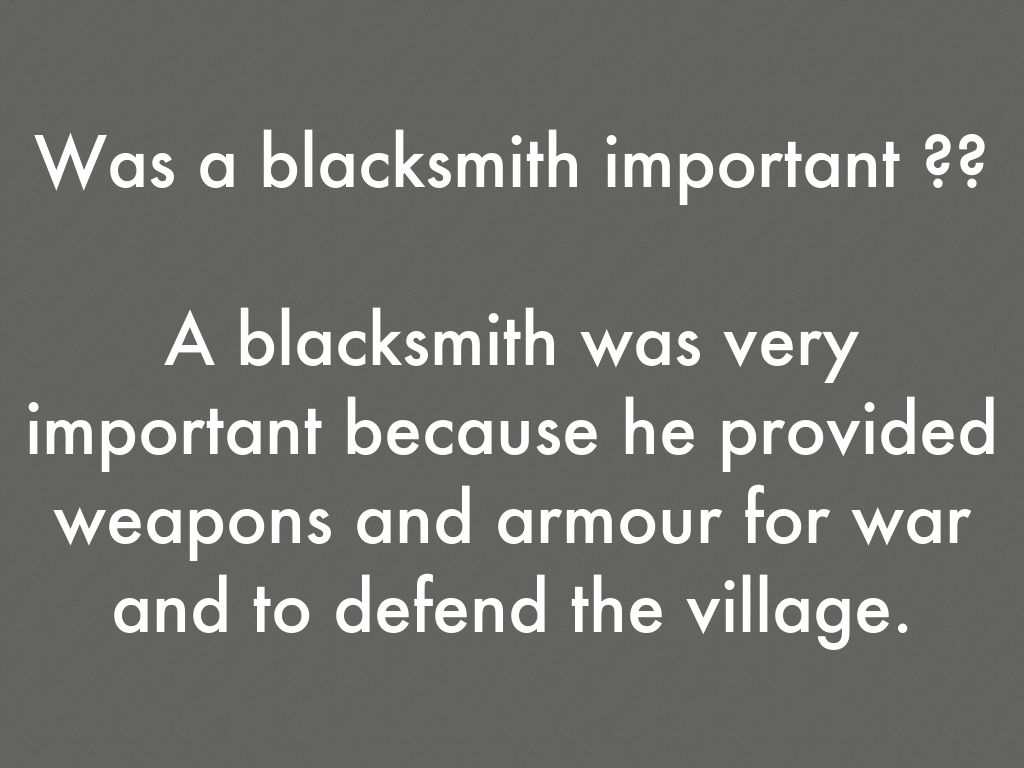 A blacksmith was very important because he provided weapons and armour for war and for the soldier that defends the village. Also they make weapons for the people of the town to uses for farming and much more.
