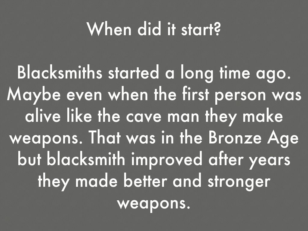 Blacksmiths started a long time ago. Maybe even when the first person was alive like the cave man they make weapons. That was in the Bronze Age but blacksmith improved after years they made better and stronger weapons.
