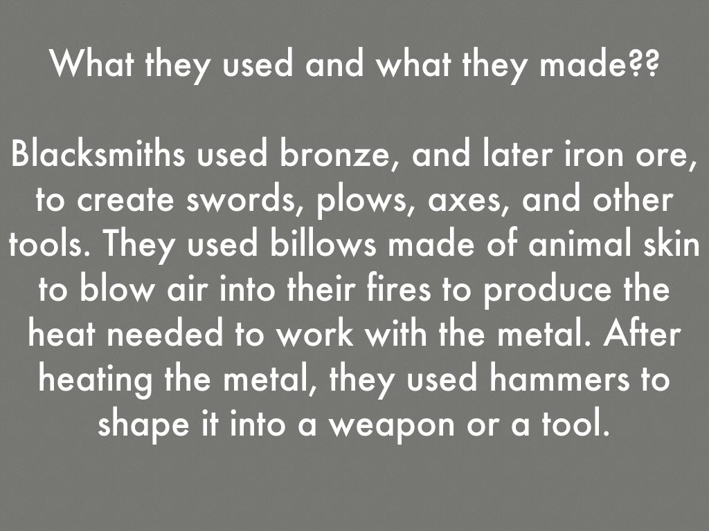 Blacksmiths used bronze, and later iron ore, to create swords, plows, axes, and other tools. They used billows made of animal skin to blow air into their fires to produce the heat needed to work with the metal. After heating the metal, they used hammers to shape it into a weapon or a tool.