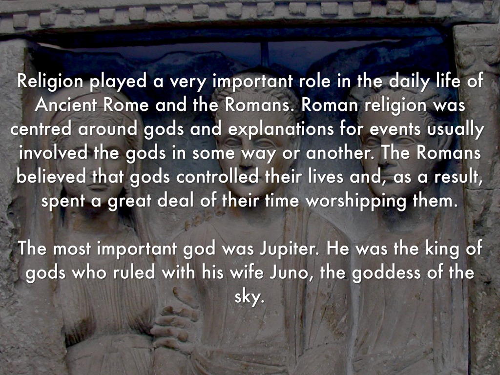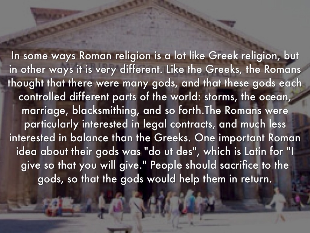 In some ways Roman religion is a lot like Greek religion, but in other ways it is very different. Like the Greeks, the Romans thought that there were many gods, and that these gods each controlled different parts of the world: storms, the ocean, marriage, blacksmithing, and so forth.The Romans were particularly interested in legal contracts, and much less interested in balance than the Greeks. One important Roman idea about their gods was "do ut des", which is Latin for "I give so that you will give." People should sacrifice to the gods, so that the gods would help them in return.