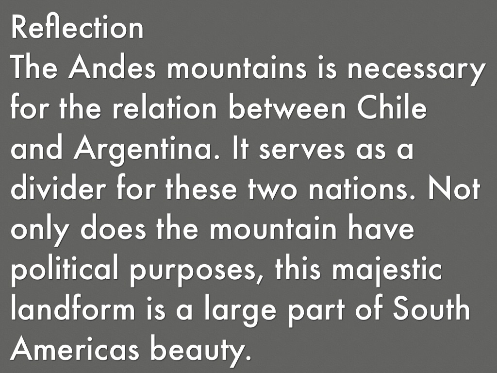 The Andes mountains is necessary for the relation between Chile and Argentina. It serves as a divider for these two nations. Not only does the mountain have political purposes, this majestic landform is a large part of South Americas beauty.