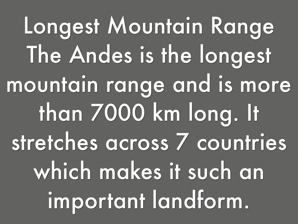 The Andes is the longest mountain range and is more than 7000 km long. It stretches across 7 countries which makes it such an important landform.
