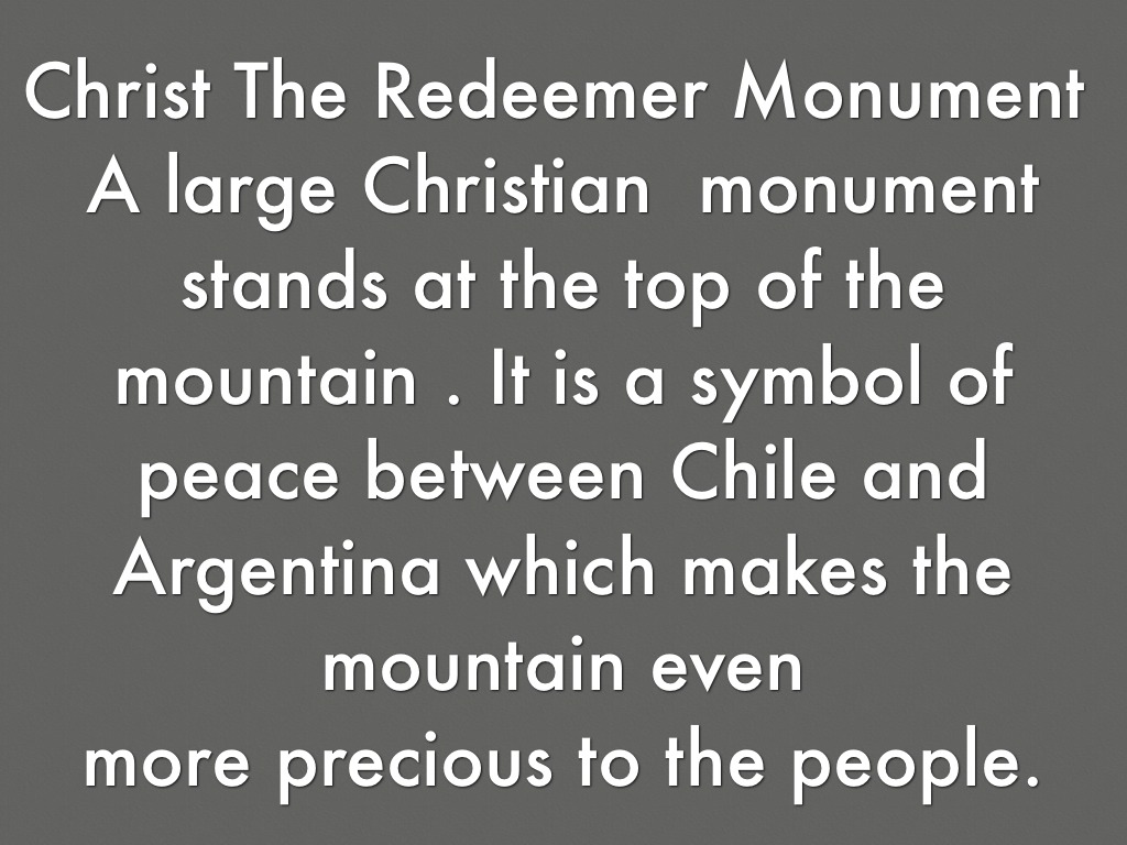 A large Christian monument stands at the top of the mountain . It is a symbol of peace between Chile and Argentina which makes the mountain even