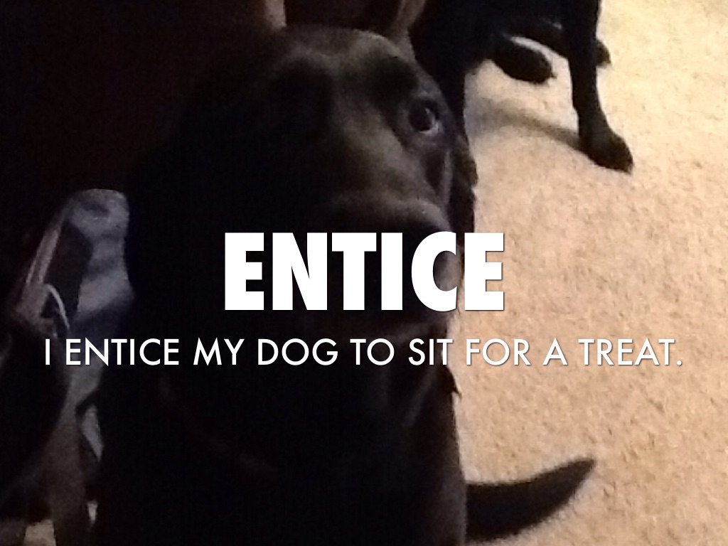 I ENTICE MY DOG TO SIT FOR A TREAT.